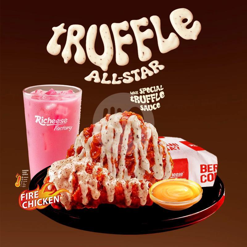 1 Fire Chicken (level 0-5) +Truffle Sauce + 1 Rice + 1 Medium Drink + Cheese Sauce