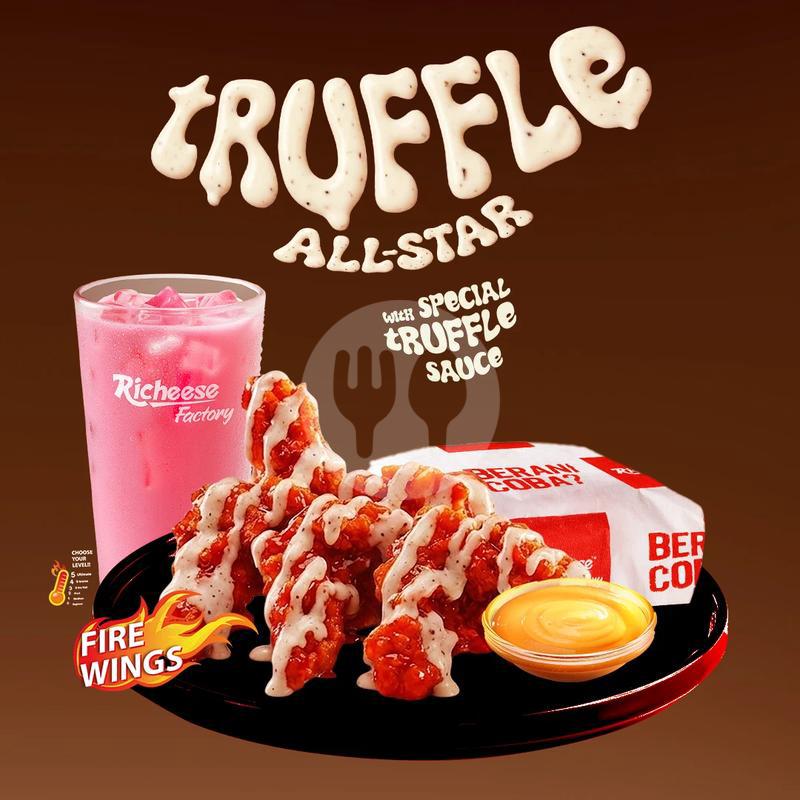 4 Pcs Fire Wings ( Level 0-5 ) + Truffle Sauce + 1 Rice + 1 Medium Drink + Cheese Sauce