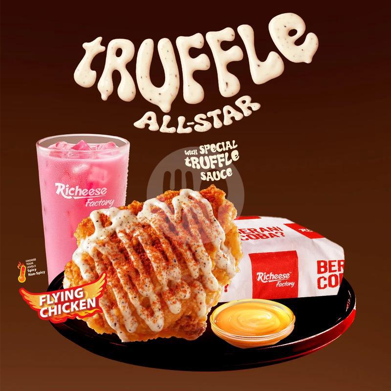 1 Flying Chicken Spicy / Non Spicy +Truffle Sauce + 1 Rice + 1 Medium Drink + Cheese Sauce
