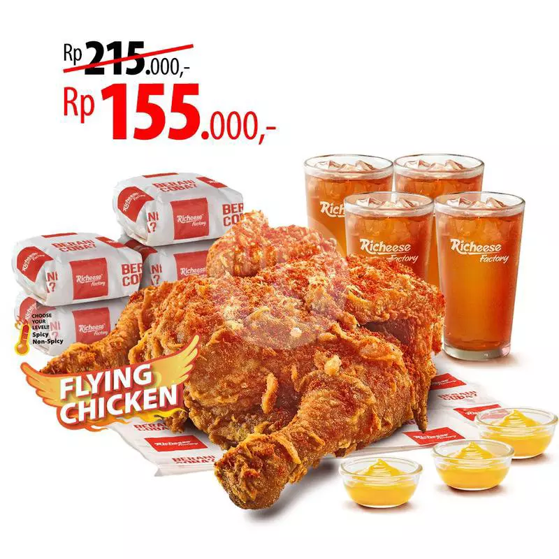 1 Flying Chicken (Spicy/Non Spicy) + 4 Rice + 4 Small Drink + Cheese Sauce. Normal Price Rp.215.000