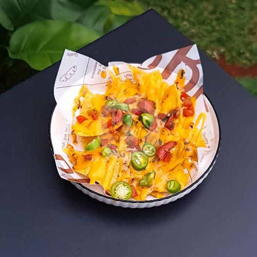 Tortilla goreng dengan salsa tomat, saus keju dan acar cabai jalapeno.