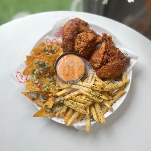 kudapan special Rumah Kopiku berisikan sayap ayam segar dan tortilla salsa dipadukan dengan kentang goreng serta saus mayo pedas.
