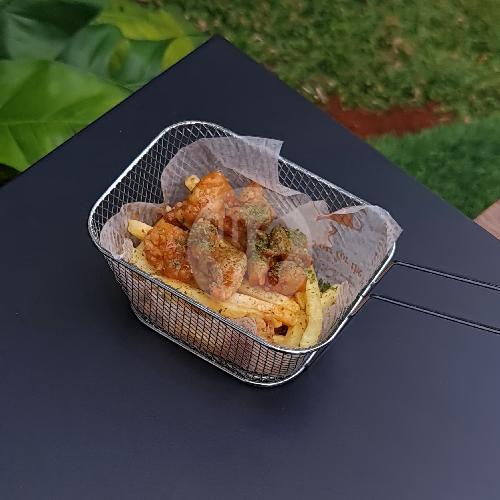 ayam karage di dampingi dengan kentang goreng disiram saus barbeque