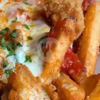 Kentang goreng dan Sosis dibalur saos Mayonaise - Cheese Saos dan Mozzarella Asri .