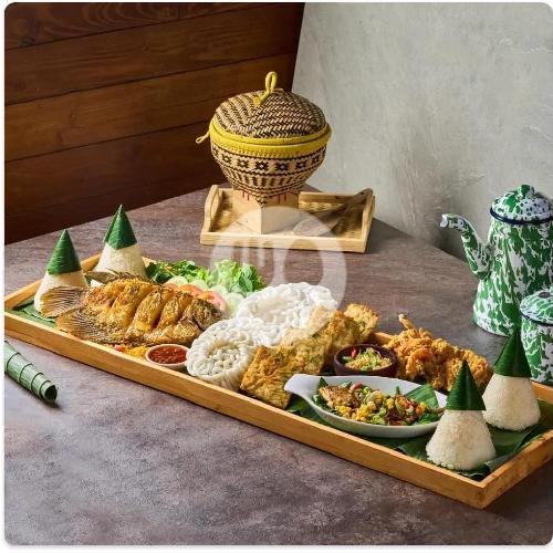Nasi liwet dengan teri medan + ayam kampung/gurame goreng + udang goreng tepung + tim peda + tempe/tahu +karedok + sambal