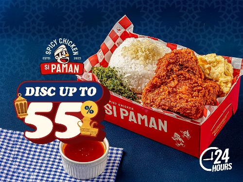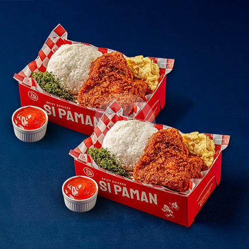 Komplitnya double, cocok buat makan bareng si ayang beb (2 Pilihan Nasi + 2 Ayam Spicy + 2 Scrambled Egg + 2 Crispy Bayam/Kremes + 2 Saus Sachet). Rekomendasi nasi bom buat yang suka pedas