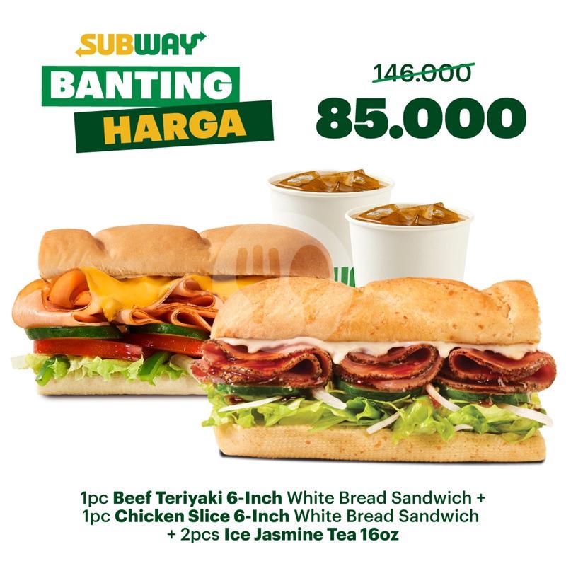 1 Beef Teriyaki 6-inch Whte Bread Sandwich + 1 Chicken Slice 6-inch White Bread Sandwich + 2 Jasmine Tea 16oz