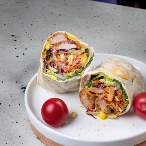 Salad wrap berisi chicken crispy renyah, jagung, wortel, kol ungu dan timun.