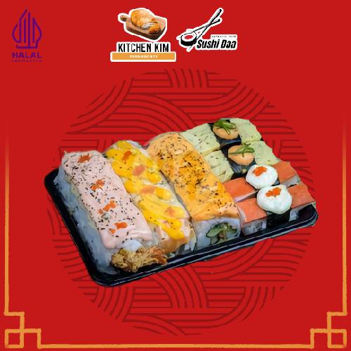 Spesial salmon roll masing- masing 4 pcs mayo chesee, honey (madu+ lemon), mentai. 2 pcs kani nigiri mayo ori, 2 pcs tamagoyaki mayo spacy(kecap asin + bon cabe + wasabi)