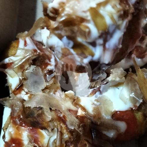 10 bola takoyaki isi (salmon, crabstik, keju, sosis, bakso) dengan toping pilihan: mayones pilihan, saos sambel, saos teriyaki n taburan katsuobushi/ikan cangkalang