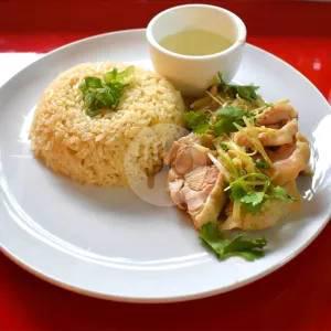 Nasi Hainan komplit ala Toedjoeh Naga dengan potongan ayam pek cham kee yang gurih dan lezat serta kuah hangat sebagai pelengkap.