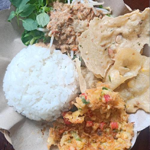 Nasi pecel komplit+sayuran rebus fres+gorengan+sambal kacang+peyek+ telor dadar