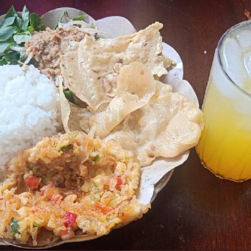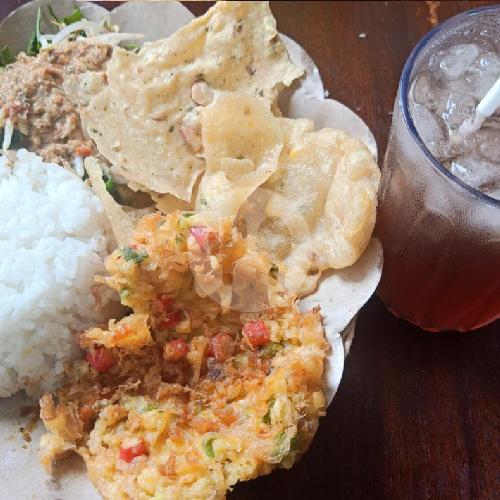 1 porsi Nasi pecel komplit+gorengan+sambal kacang+peyek+sayuran rebus fresh+telor dadar+es jeruk manis