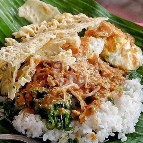 1 porsi Nasi pecel madiun komplit+gorengan+peyek+sayuran rebus fresh+sambal kacang+telor dadar+es teh manis
