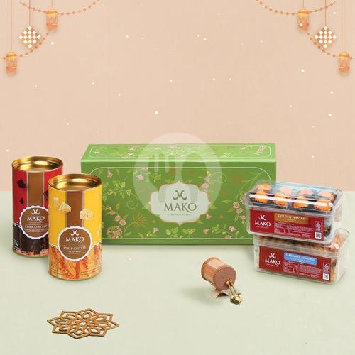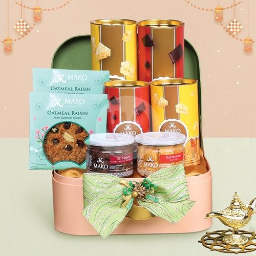 1 Cat's Tounge + 1 Golden Nastar + 1 Kastengels Mini Jar + 1 St Choco Mini Jar + 1 Choco Strip Medium + 1 Strip Cheese Medium + 1 Crunchy Mede + 2 Oatmeal Raisin + 2 Choco Strip + 2 Strip Cheese