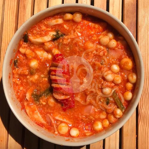 Kerupuk, telur, sosis iris, sayur, mie, sosis merah.