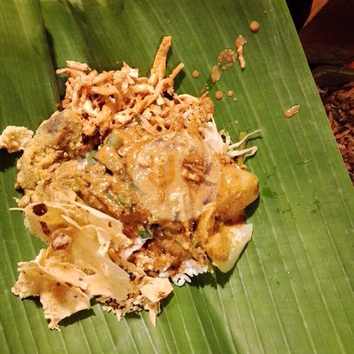 Nasi, Bumbu Pecel, Kangkung, Kecambah, Sambal goreng Tahu, Peyek, Telur Barendo