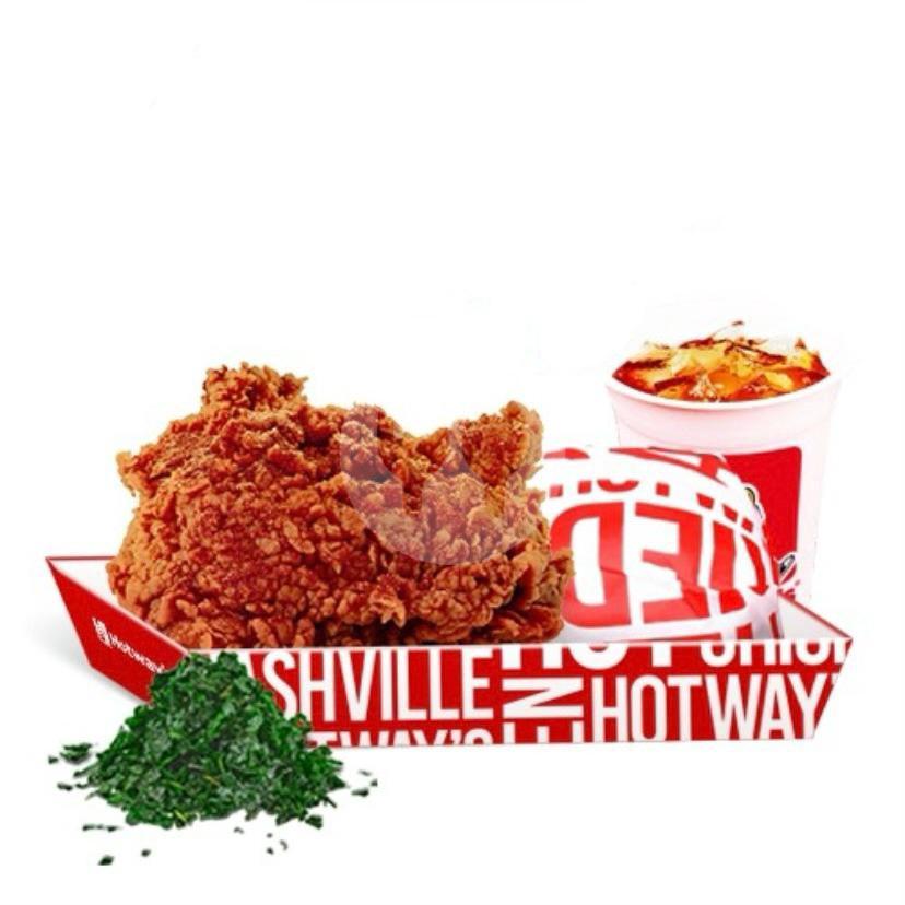Nasi + nashville sayap/paha bawah + triple crispy spinach + regular ice tea (tidak bisa memilih varian ayam)