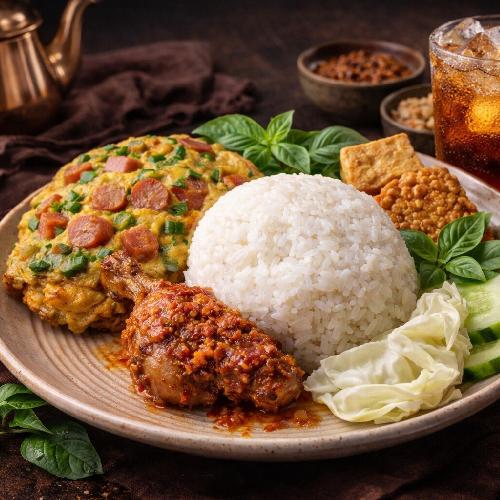 Nasi Hangat + Ayam Geprek Komplit Tahu/Tempe+ Lalapan Segar +Sambal+ Telur Barendo sosis