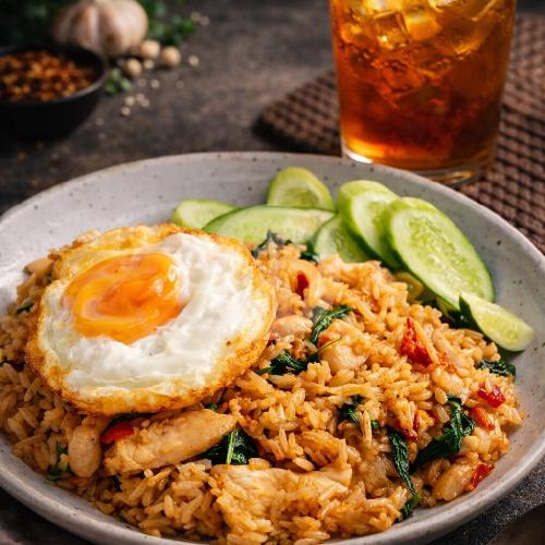 Nasi goreng + Telur Ceplok +telur orak arik + ayam suwir/bakso. sosis, potongan sayuran segar dengan bumbu rempah aromatik yg khas