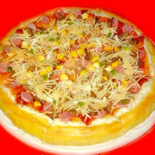 Saus beef / saus chicken, irisan sosis, corn, bawang bombay, paprika, mayonneise, cheese mozarella / mozarella standar