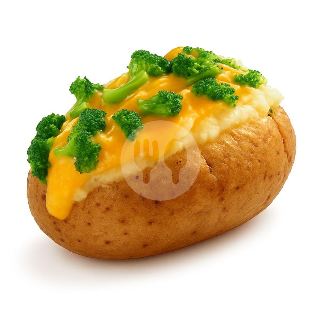 Fluffy baked potato served hot, topped with boiled broccoli and Raffel's famous cheddar cheese.