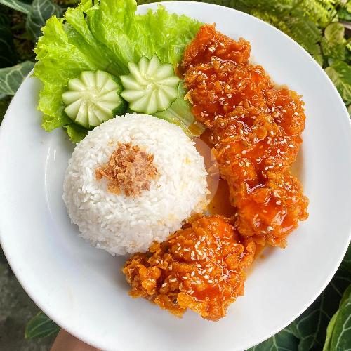 Nasi, Dada Ayam ,dengan Saus Lava Pedas Manis