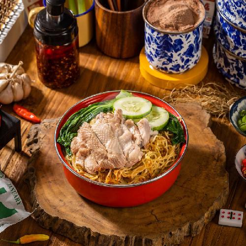 perpaduan mie kuning tipis dan kenyal yang diaduk dengan bumbu yang gurih disajikan dengan ayam hainan yang tebal dan juicy
