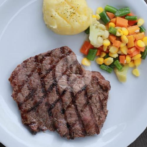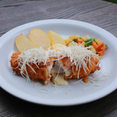 Daging Ayam Dibalut Smoked Beef dan Mozzarella Digoreng Tepung + BBQ Sauce + Topping Keju + Kentang + Sayuran