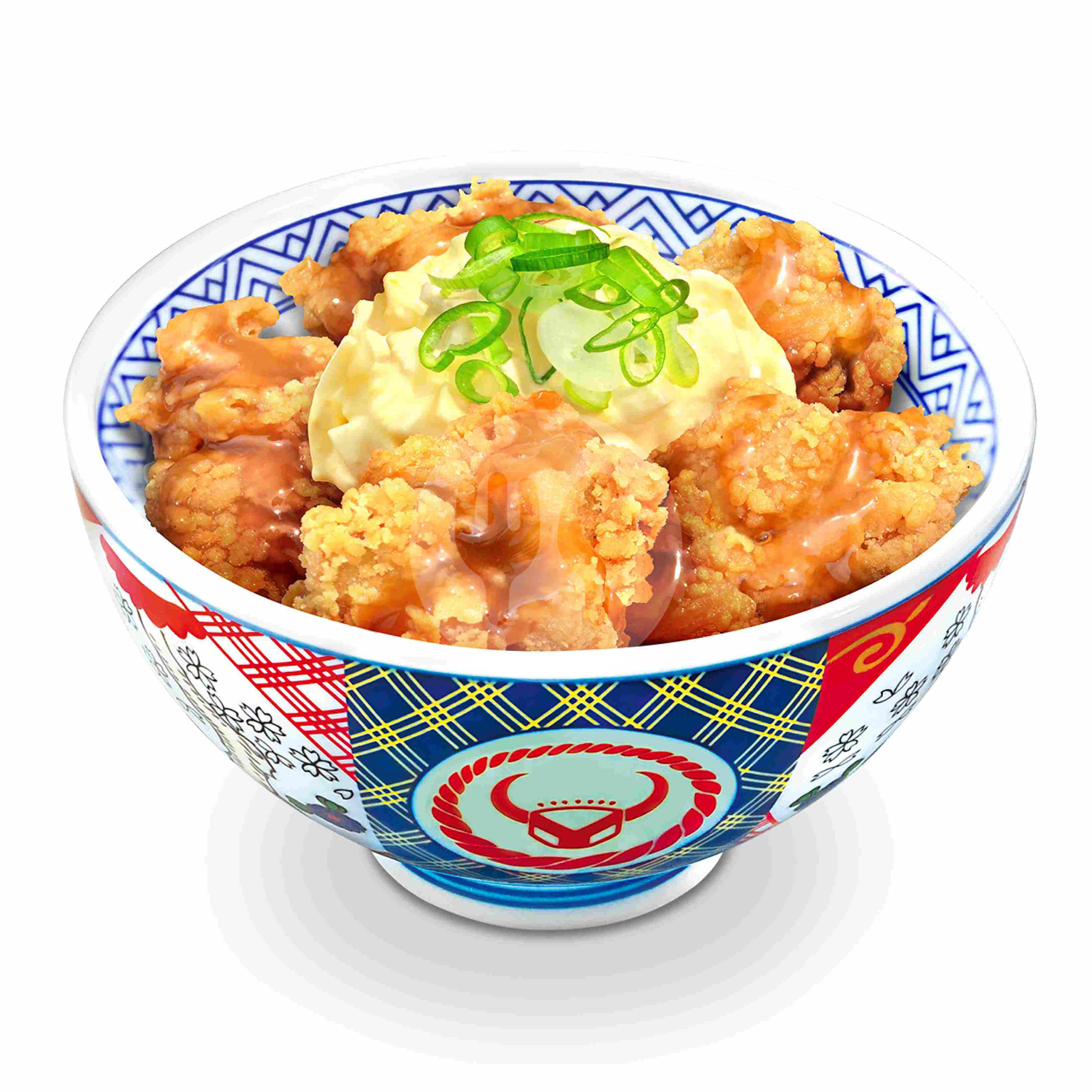 Ayam goreng tanpa tulang dengan topping campuran telur dan mayonaise yang disajikan di atas nasi