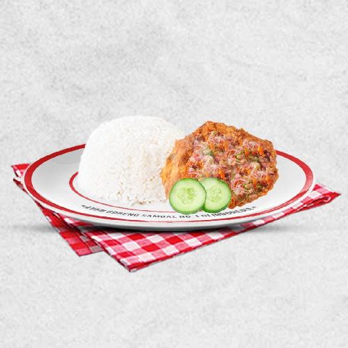 1 nasi + 1 ayam (dada/dada sayap/paha atas) + 1 porsi sambal matah