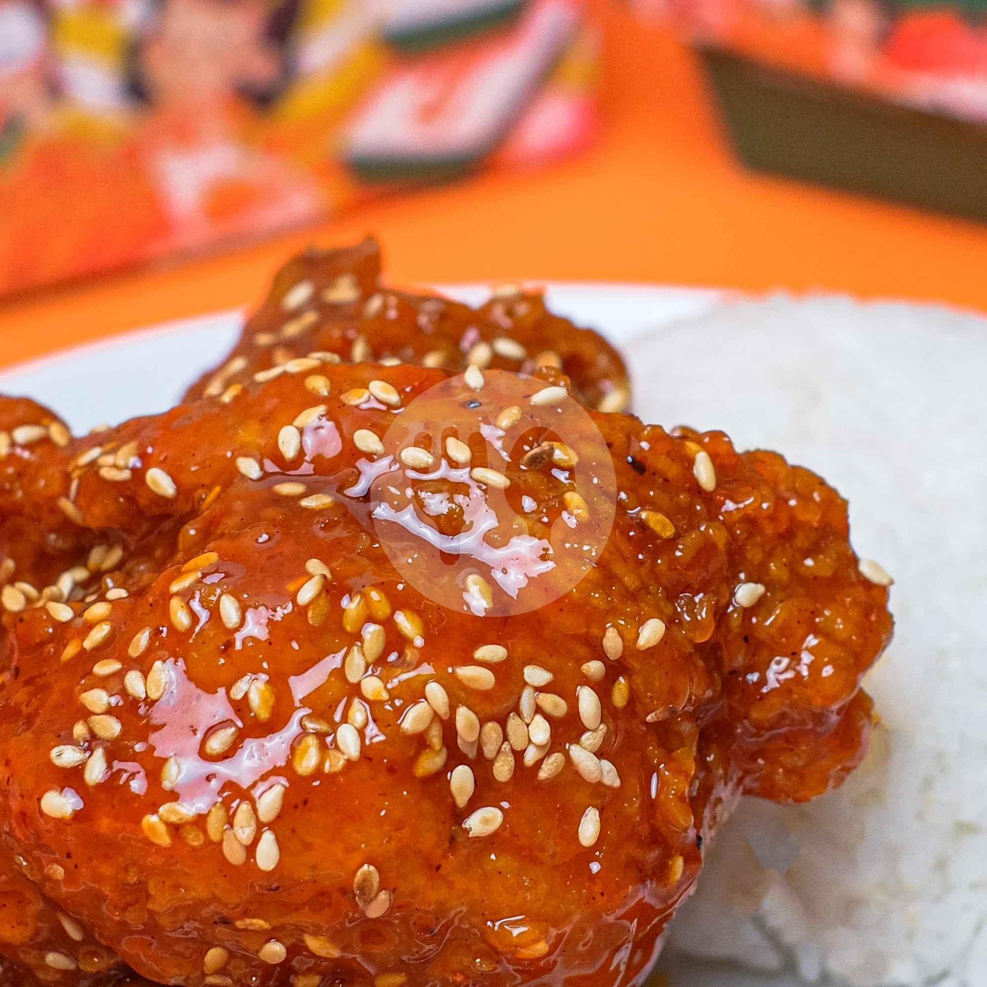 Ayam crispy jumbo dengan nasi pulen dan saus sachet