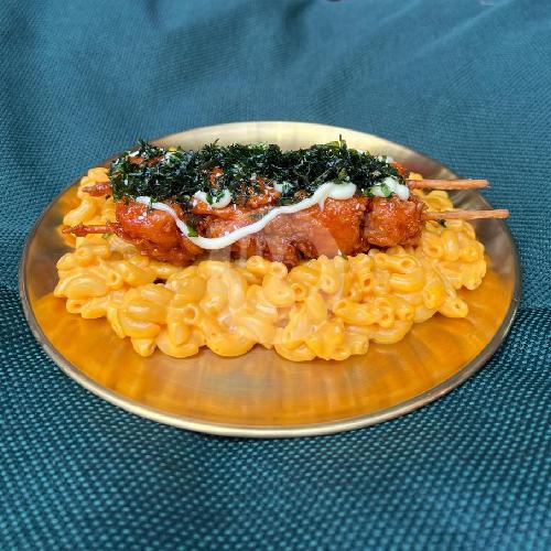 Makaroni dengan saus keju, topping 2 tusuk chicken popcorn dan nori spinach.