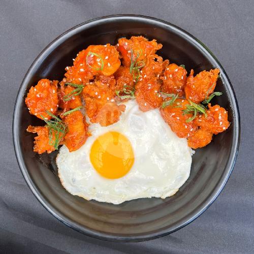 Nasi putih, telur, ayam popcorn tumis dengan saus pilihan.