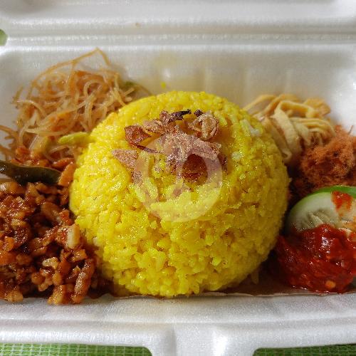 Nasi Kuning+Bihun/Bakmi Goreng+Irisan Telor+Kering Tempe+Sambal Goreng Rempelo Ati+Perkedel Kentang/Nugget(sesuai persediaan)+Sambal+Timun/Lalapan