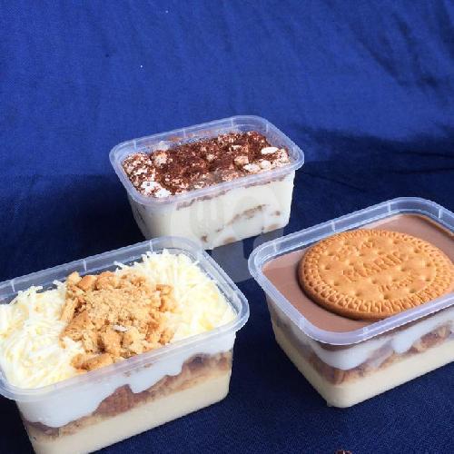 Perpaduan Cream Cheese dan Coffe yang lembut dengan dengan lapisan biskuit di tambah Regal Crumbs dan bubuk coklat di atasnya