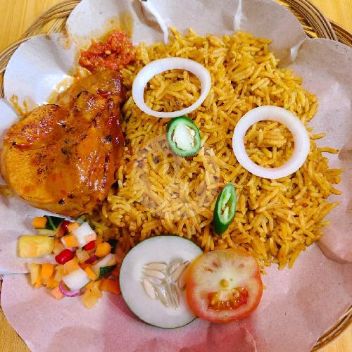 1 porsi nasi briyani yg lezat, 1 potong Ayam Kare, Acar dan sambel dilengkapi irisan tomat dan timun.