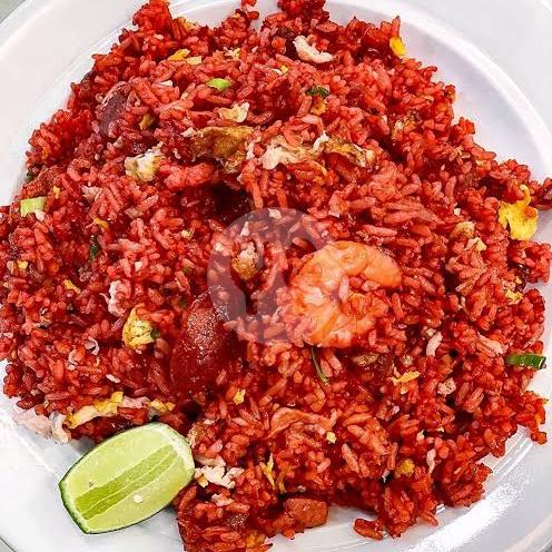 Nasi goreng merah,campuran seefood,baksosis,saus tomat,bumbu dapur yg sdh dihaluskn ,sawi,daun bawangayam suir,jeruk,timun kerupuk,bawang goreng,sambal tumis pedas