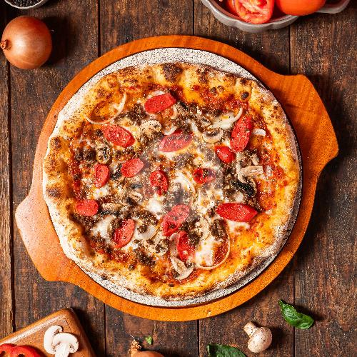 Pizza Dengan Topping Saus Tomat Khas Italia, Daging Asap Pepperoni, Bawang Bombay, Jamur Champignon, Rempah Italia, Keju Mozarella, Keju Parmesan Dan Olive Oil
