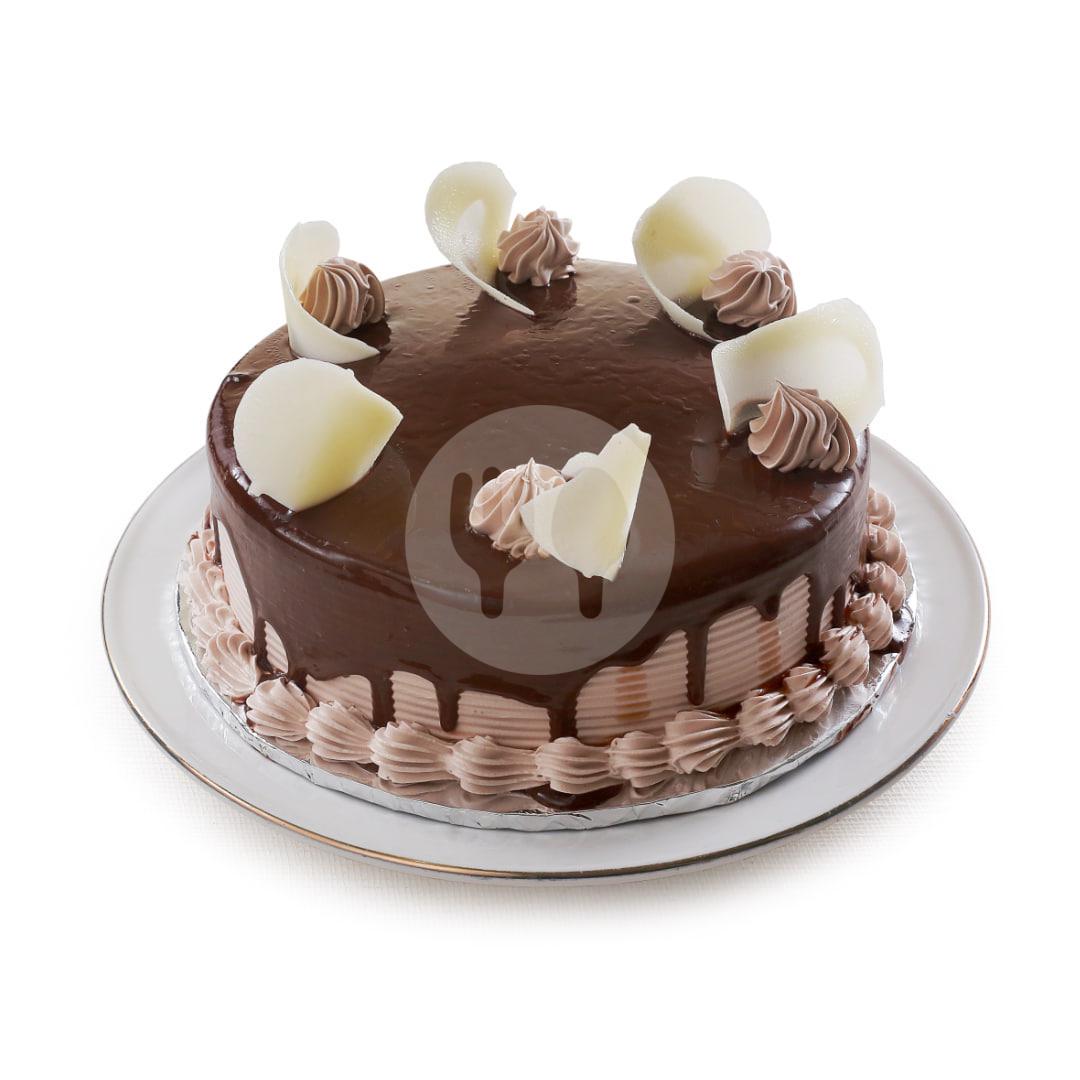 GRATIS tulisan di coklat tempel. Kue tart dengan base cake sponge cake coklat, tersembunyi di balik whipping cream coklat dan siraman cream coklat pula dilengkapi topping white chocolate.