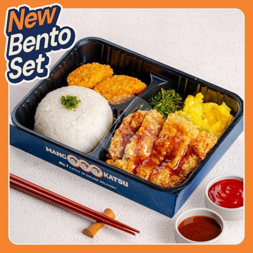 Bento box berisi nasi hangat, chicken katsu crispy, scrambled egg, crispy bayam, 2 pcs ekado + saus sachet. Sambal/saus pilihan untuk katsu tersedia (add-on Rp500–Rp2.000).