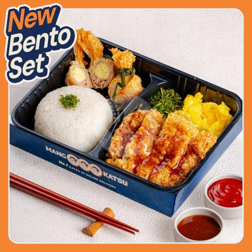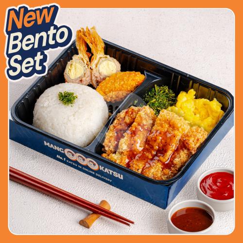 Bento box berisi nasi hangat, chicken katsu crispy, scrambled egg, crispy bayam, 1 pcs shrimp roll & 1 pcs ekado + saus sachet. Sambal/saus pilihan untuk katsu tersedia (add-on Rp500–Rp2.000).