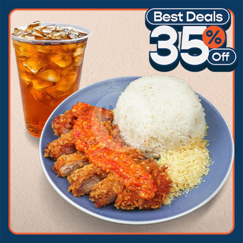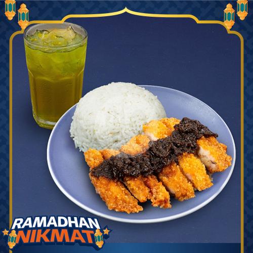 Nasi Katsu Crispy dengan bumbu rendang berempah, dipadu Es Teh Pandan Zen segar - Nasi, Chicken Katsu Crispy, Bumbu Rendang, Es Teh Pandan Zen
