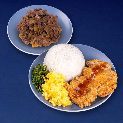 Berdua Lebih Hemat (Nasi, Chicken Katsu, Pilihan Saus, Kremes) + (Nasi, AUS Beef, Pilihan Saus)