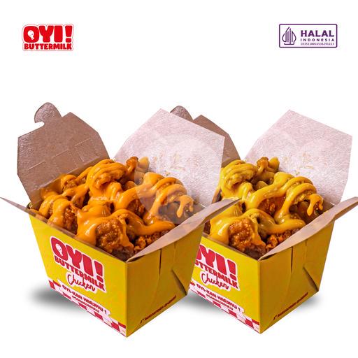 2 Pcs Nasi dengan 2 Porsi Fillet Dada yang juicy dan crispy dan 2 Sauce pilihan