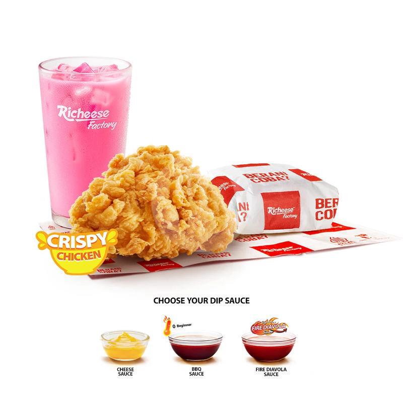1 Crispy Chicken + 1 Rice + 1 Medium Drink + Cheese Sauce / Fire Diavola / BBQ Sauce Lev-0