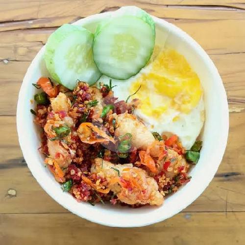 Ayam Geprek Tanpa Tulang,Nasi Putih,Telur Ceplok,Kol Goreng,Tahu Tempe,timun