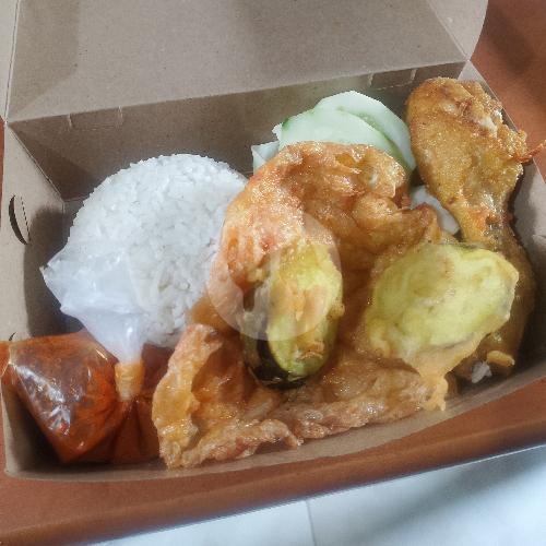 Ayam Penyet+ Nasi Ditambah Terong Dan Tempe Goreng Tepung , Sambal Terasi Beserta Lalapan Dan Telur Dadar Renyah