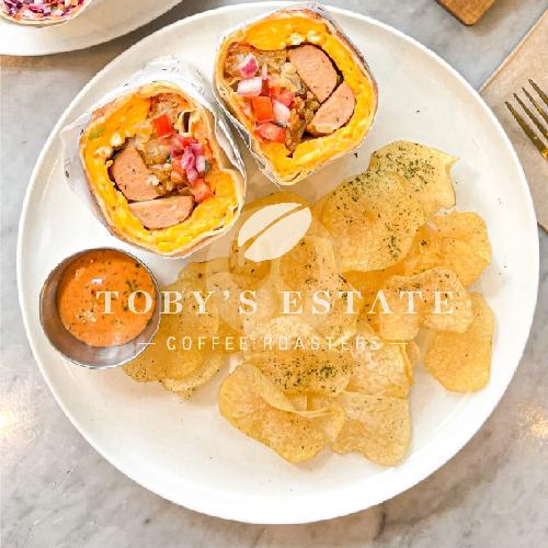Rolled up scrambled eggs, sausage, cheese, tomatoes, and chipotle mayo