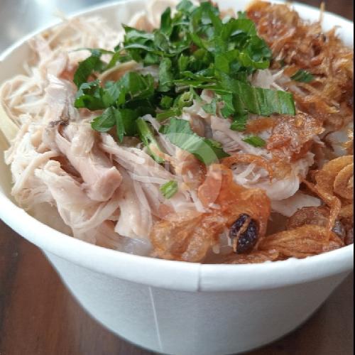 Bubur + ayam suwir + bawang goreng + seledri + kacang kedelai +krupuk + kecap manis + sambel, tempat pakai paper bowl